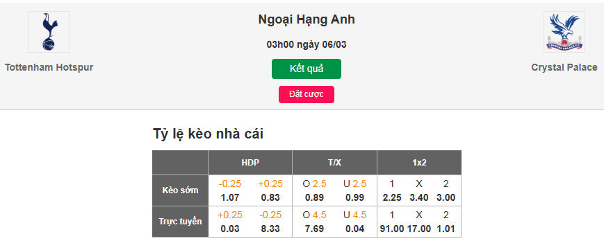 “Gà trống” đang đứng trước ngưỡng cửa của một cuộc khủng hoảng tồi tệ nhất trong nhiều thập kỷ qua. Nếu không thể giành điểm trước Crystal Palace rạng sáng nay, tương lai của HLV Igor Tudor cũng như vị thế của Spurs tại giải đấu cao nhất xứ sở sương mù sẽ bị đe dọa nghiêm trọng. Hy vọng những phân tích chi tiết trong bài viết Soi kèo Tottenham vs Crystal Palace, 03h00 ngày 6/3 này đã mang đến cho quý độc giả cái nhìn trọn vẹn và những gợi ý đầu tư chuẩn xác nhất. Hãy cùng chờ đón xem bản lĩnh của các cầu thủ London sẽ được thể hiện như thế nào trong trận derby sinh tử này. Chúc các bạn may mắn với quyết định Soi kèo Tottenham vs Crystal Palace, 03h00 ngày 6/3 của mình!